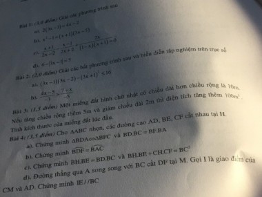 MÔN TOÁN LỚP 8 ON THI HỌC KỲ 2 NGÀY HỌC THỨ 22 Bài 1: (3,0 diêm) Giái các phương trình sau a). 2(3х -1) - 4х - 2 b). x'-1=(x+1)(3x-5) 2x x+1 x-1 c). 2x-2 2x+2 (1-x)(x+1)3D0 d). 6-3x-1=5 a). (3x-1)(3x-2)-(3x+1)s16 4x-5 7-x b). -3 -5 Tính kích thưrớc của miếng đất lúc đu. Bài 4: (3,5 điêm) Cho AABC nhọn, các đường cao AD, BE, CF cắt nhau tại H a). Chứng minh ABDACABFC và BD.BC = BFBA b). Chứng minh BDF=BAC c). Chứng minh BH.BE =BD.BC và BH.BE+CH.CF=BC? CM và AD. Chứng minh IE//BC http://vites google.com/site/123onthi a). (x-1 ON THI HOC Kỳ ) NOTEBO KUA