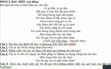 PHẢN I: ĐỌC HIỂU (4,0 điểm) Đọc khổ thơ sau và thực hiện các yêu cầu: Có gì đâu, có gì đâu Mỡ màu ít chất dồn lâu hoá nhiều Rễ siêng không ngại đất nghèo Tre bao nhiêu rễ bẩy nhiêu cần cù Vươn mình trong gió tre đu Cây kham khổ vẫn hát rụ lá cành Yêu nhiều nắng nỏ trời xanh Tre xanh không đứng khuất mình bóng râm Bão bùng thân bọc lấy thân Tay ôm tay niu tre gần nhau thêm. (Trích Tre Việt Nam - Nguyễn Duy) Câu 1. Em hãy xác định thể thơ và phương thức biểu đạt chính? Câu 2. Chỉ ra các từ láy trong đoạn thơ trên? Câu 3. Phẩm chất của cây tre được thể hiện qua những chi tiết nào? Câu 4. Chỉ ra và nêu tác dụng của biện pháp tu từđược sử dụng trong hai câu thơ: "Bão bùng thân bọc lấy thân Tay ôm tay niu tre gần nhau thêm" Câu 5. Theo em. hình ảnh cây tre đã gợi lên những.phẩm chất cao quý nào của dân tộc ViệtNam?