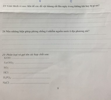 ----- Nội dung dịch tự động từ ảnh ----- 8 23/ Giải thích vì sao: Khi để các đồ vật bằnng sắt lâu ngày trong không khí hay bị gỉ sét? 24 Nêu những biện pháp phòng chống ô nhiễm nguồn nước ở địa phương em? 25/ Phân loại và gọi tên các hợp chất sau: KOH: Fe(OH)₂: SO3: ......... HCI: ...... H3PO4: ...... NaCl: .... 6