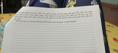 ----- Nội dung dịch tự động từ ảnh ----- Đêm trước ngày biểu diễn Linh đã bị sót, mặc dù Linh đã chuẩn bị săn trang phục biểu diễn cho Lớp Linh tham gia biểu diễn văn nghệ kỷ niệm 40 năm ngày nhà giáo Việt Nam vào sáng ngày 20/11 2022. Linh được phân công chuẩn bị trang phục biểu diễn cho tiết mục của lớp. các bạn. Nếu là Linh, em sẽ làm thế nào để thể hiện mình là người có trách nhiệm?