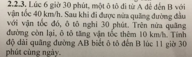 Giúp mình bài này với ạ ----- Nội dung dịch tự động từ ảnh ----- Lúc 6 giờ 30 phút, một ô tô đi từ A để đến B với vận tốc 40 km/h. Sau khi đi được nửa quãng đường đầu với vận tốc đó, ô tô nghỉ 30 phút. Trên nửa quãng đường còn lại, ô tô tăng vận tốc thêm 10 km/h. Tính độ dài quãng đường AB biết ô tô đến B lúc 11 giờ 30 phút cùng ngày.