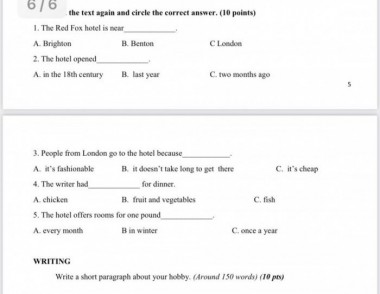 ----- Nội dung dịch tự động từ ảnh ----- Viettel Xong 6/6 K10TA A2 TEST.pdf 9. The writer booked his room by telephone. 10. The beds in the hotel aren't very wide. the text again and circle the correct answer. (10 points) 1. The Red Fox hotel is near A. Brighton 2. The hotel opened_ A. in the 18th century 10:22 B. WRITING B. last year 3. People from London go to the hotel because_ A. it's fashionable 4. The writer had A. chicken 5. The hotel offers rooms for one pound_ A. every month B in winter for dinner. B. it doesn't take long to get there B. fruit and vegetables don C. two months ago THE END C. fish Q C. it's cheap C. once a year Write a short paragraph about your hobby. (Around 150 words) (10 pts) 63% 5