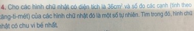 Cho các hình chữ nhật có diện tích 36cm2 và số đo các cạnh của các hình chữ nhật là một số tự nhiên