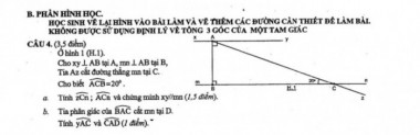 B. PHẦN HÌNH HỌC. HỌC SINH VẼ LẠI HÌNH VÀO BÀI LÀM VÀ VẼ THÊM CÁC ĐƯỜNG CẦN THIẾT ĐỂ LÀM BÀI. KHÔNG ĐƯỢC SỬ DỤNG ĐỊNH LÝ VỀ TỔNG 3 GÓC CỦA MỘT TAM GIÁC CÂU 4. (3,5 điểm) Ở hình 1 (H.1). Cho xy L AB tại A, mn L AB tại B, Tia Az cắt đường thẳng mn tại C. Cho biết ACB=20. m a. b. Tia phân giác của BAC cắt mn tại D. Tính yAC và CAD (1 điểm). □ B Tính zCn; ACn và chứng minh xy//mn (1,5 điểm). H.1 20 n