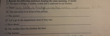 I. Rewrite the following sentences keeping the same meaning. (1 mark) 33. We have a fridge, a cooker, a sink and a cupboard in our kitchen. → There is a Sink, a fridge, a cooken and a cuphanting kitchen 34. The television is in front of the picture. -> The picture 35. Let's go to the department store to buy one. -> How about 36. My mother likes the kitchen the best. -> The kitchen