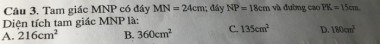 Câu 3. Tam giác MNP có đáy MN = 24cm; đáy NP = 18cm và đường cao PK =15cm.