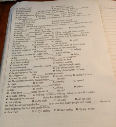 Choose the correct answer:A. smoking / to quit C. smoke / quitting 33.He has arranged A. to meet / be 34. I have an important A. told / given 35. She was hesitant B. to smoke / quit D. for smoking / of quitting the visitors at the factory. It is necessary that he D. met / was you this document. B. meeting / to be C. meet / being thing. you before B. tell / give C. telling / to give D. to tell / giving the coach of her problem and she thanked her coach with the pressure. B. tell / helping / dealing A. telling / to help / deal C. told/help/ dealing D. to tell / for helping / to deal 36.Thanks to effective birth control methods, women can delay more time A. have / taken 37.Avoid part in social work. B. having / to take C. had / take those mistakes again when D. to have / taking B. make /to write C. making/writing D. made / written the work. A. to make / write 38. We will have our house A. to repaint/ doing 39. We postponed A. make My cousins will come and help us C. repainting/ to do D. repainted/ doing B. repainted/ do any decision in the meeting. B. to make I would rather not 40. I am busy A. working/go 41.African people are used A. to walk B. to walking 42.She was so nice that he couldn't help A. fall 43. I do not mind A. to help / working C. to help /to work 44. Jean detested 48. What about A. to walk / taking 49. The police recommend A. not walking B. to work/ to go barefoot She often refused A. photographed / have C. be photographed / having 45. I happened John A. to see /to cross 46. The robbers forced C. to fall B. falling you whenever I finish B. see/ crossed the bank manager B. to open C. making out for lunch. C. worked / going D. work / going so they get very rough skin. C. walked in love with her. B. not to walk 50. Neil Armstrong was the first when he placed his first step on the Moon. B. to fly / seeing A. flew/see the street yesterday. children and they have D. made on my reports. B. helping /to work D. helping / working her photographs taken. on time. D. walking C. opening reservations. D. fallen B. to be photographed / had D. being photographed / to have C. taking the car? A. open 47. Your responsibility includes A. take B. to take home instead of B. walking / to take C. walking / taking D. to walk / to take along that street at night. D. do not walk C. not walk in a spaceship. Many people still recall C. flown/seeing D. flying / to see C. to see / crossing D. seeing / to cross the safe. D. opened her D. taken buto alla they can ci? the scene |