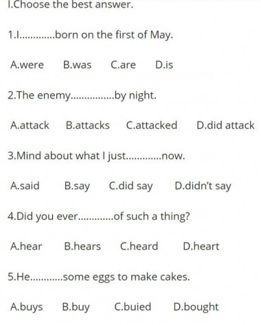 ----- Nội dung dịch tự động từ ảnh ----- 1.Choose the best answer. 1...............born on the first of May. A.were B.was C.are D.is 2.The enemy................by night. A.attack B.attacks C.attacked D.did attack 3.Mind about what I just..............now. A.said B.say C.did say 4.Did you ever............... of such a thing? A.hear B.hears C.heard D.didn't say A.buys B.buy C.buied D.heart 5.He............some eggs to make cakes. D.bought