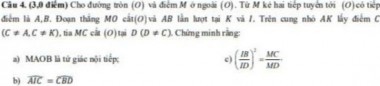 Câu 4. (3,0 điểm) Cho đường tròn (O) và điểm M ở ngoài (O). Từ M kẻ hai tiếp tuyến tới (O) có tiếp điểm là A, B. Đoạn thẳng MO cắt (O) và AB lần lượt tại K và I. Trên cung nhỏ AK lấy điểm C