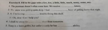 1. The postman doesn’t often come here. We receive ______________ letters. 2. The snow was getting quite deep. I had ______________ hope of getting home that night. 3. A: I’m having ______________ trouble fixing this shelf. B: Oh, dear. Can I help you? 4. I shall be away for ______________ days from tomorrow. 5. Tony is a keen golfer, but unfortunately he has ______________ ability.
