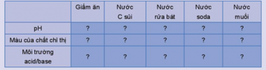 - Cho vài giọt chất chỉ thị lần lượt vào các dung dịch: giấm ăn, nước C sủi, nước rửa bát, nước soda, nước muối và khuấy đều. Quan sát sự đổi màu của các dung dịch.