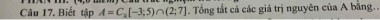 Câu 17. Biết tập A = C[-3;5) ∩ (2;7]. Tổng tất cả các giá trị nguyên của A bằng...