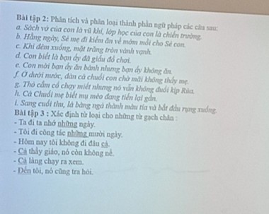 ----- Nội dung ảnh ----- Bài tập 2: Phân tích và phân loại thành phần ngữ pháp các câu sau: a. Sách vở của con là vì khít, lớp học của con là chiến trường. b. Hằng ngày, Sẻ mẹ đi kiếm ăn về món mới cho Sẻ con. c. Khi đêm xuống, mặt trăng tròn vành vạnh. d. Con biết là bạn ấy đang bắn nhau không? e. Còn Mịn bạn đã ăn bánh nhưng bạn ấy không ăn. f. Ở dưới nước, dàn cà chuối con chờ mài không thấy mẹ. g. Tiểu cá chơi nhiều miệng nhưng nó vẫn không đụng tí nào. h. Cà Chúi mẹ biết mấy mèo đang tiến lại gần. i. Sam cuối thu, là băng ngựa thành màu trà và bắt đầu rưng rưng.