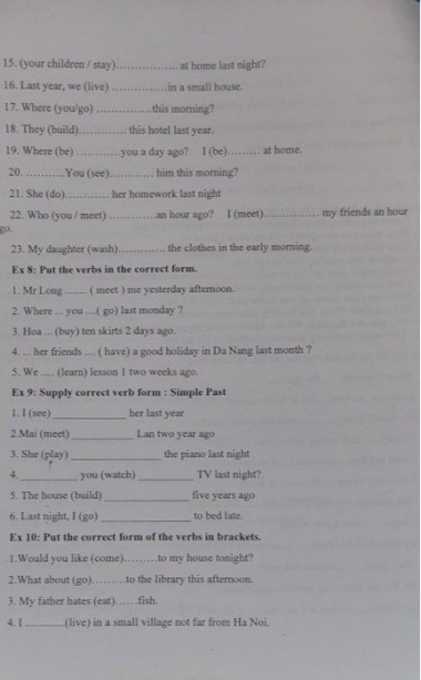 ----- Nội dung ảnh ----- 1. (see) ____ her last year 2. (meet) ____ I am two years ago 3. (build) ____ the house (go) ____ last night 4. (go) ____ to bed last 5. (go) ____ five years ago 6. (eat) ____ fish. 7. (come) ____ to my house tonight? 8. What about (go) ____ to the library this afternoon? 9. (be) ____ you ten shirts 2 days ago? 10. (have) ____ a good holiday in Da Nang last month? 11. (do) ____ your children stay at home last night? 12. (live) ____ in a small house. 13. (play) ____ the piano last night? 14. (go) ____ this hotel last year. 15. (see) ____ you a day ago? 16. Where (be) ____ him this morning? 17. Where (go) ____ we (live) ____ in a small village not far from Hà Nội? 18. (wash) ____ the clothes in the early morning. 19. (meet) ____ me yesterday afternoon. 20. Where (go) ____ last Monday? 21. (meet) ____ my friends an hour ago?