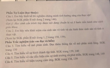 Giúp e câu 1 câu 2 tự luận vs ạ ----- Nội dung ảnh ----- Phần Tự Luận (học thuộc) Câu 1. Em hãy thiết kế thí nghiệm chứng minh tính hướng sáng của thực vật? (Xem lại SGK phần II nội dung 2 trang 146). Gợi ý: Học sinh cần trình bày được nội dung chuẩn bị và 3 bước tiến hành như sau: giáo khoa. Câu 2. Em hãy nêu khái niệm của sinh sản vô tính và các hình thức sinh sản vô tính ở thực vật. (Xem lại SGK phần II nội dung 1, 2 trang 158, 159).