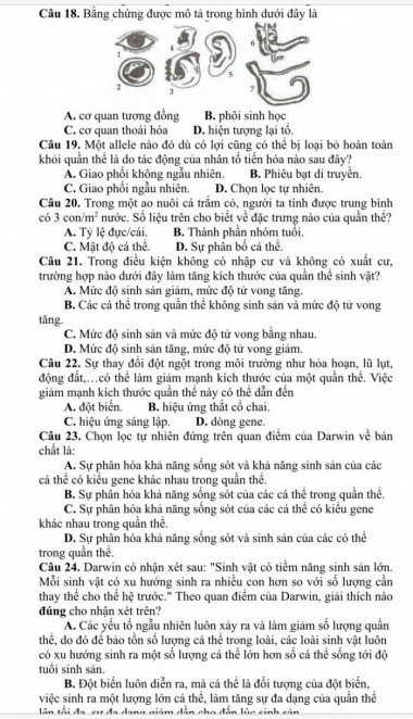 Bằng chứng được mô tả trong hình dưới đây là. Một allele nào đó đủ điều kiện có lợi cũng có thể bị loại bỏ hoàn toàn khỏi quần thể là do tác động của nhân tố tiến hóa nào sau đây?----- Nội dung ảnh ----- ÔN TẬP GIỮA HK II SINH 12.d... Câu 18. Bảng chứng được mô tả trong hình dưới đây là A. cơ quan tương đồng B. phôi sinh học C. cơ quan thoái hóa D. hiện tượng lại tổ. Câu 19. Một allele nào đó đủ điều kiện có lợi cũng có thể bị loại bỏ hoàn toàn khỏi quần thể là do tác động của nhân tố tiến hóa nào sau đây? A. Giao phối không ngẫu nhiên. B. Phếu bạt di truyền. C. Giao phối ngẫu nhiên. D. Chọn lọc tự nhiên. Câu 20. Trong một ao nuôi cá trắm cỏ, người ta tính được trung bình có 3 con/m² nước. Số liệu trên cho biết về đặc trưng của quần thể? A. Tỷ lệ dự/cá. B. Thành phần nhóm tuổi. C. Mật độ cá thể. D. Sự phân bố cá thể. Câu 21. Trong điều kiện không có nhập cư và không có xuất cư, trường hợp nào dưới đây làm tăng kích thước quần thể sinh vật? A. Mức độ sinh sản giảm, mức độ tử vong tăng. B. Các cá thể trong quần thể không sinh sản và mức độ tử vong tăng. C. Mức độ sinh sản và mức độ tử vong bằng nhau. D. Mức độ sinh sản tăng, mức độ tử vong giảm. Câu 22. Sự thay đổi đột ngột trong môi trường như hoả hoạn, lũ lụt, động đất... có thể làm giảm mạnh kích thước của một quần thể. Việc giảm mạnh kích thước quần thể này có thể dẫn đến A. đột biến. B. hiệu ứng tất cả chai. C. hiệu ứng sàng lọc. D. dòng gene. Câu 23. Chọn lọc tự nhiên đúng trên quan điểm của Darwin về bản chất là: A. Sự phân hóa khả năng sống sót và khả năng sinh sản của các cá thể có kiểu gene khác nhau trong quần thể. B. Sự phân hóa khả năng sống sót của các cá thể trong quần thể. C. Sự phân hóa khả năng sống sót của các cá thể có kiểu gene khác nhau trong quần thể. D. Sự phân hóa khả năng sống sót và sinh sản của các thể trong quần thể. Câu 24. Darwin có nhận xét sau: "Sinh vật có tiềm năng sinh sản lớn. Mỗi sinh vật có xu hướng sinh ra nhiều con hơn so với số lượng cần thay thế cho thế hệ trước." Theo quan điểm của Darwin, giải thích nào đúng cho nhận xét trên? A. Các yếu tố ngẫu nhiên luôn xảy ra và làm giảm số lượng quần thể, do đó để bảo tồn số lượng cá thể trong loài, các loài sinh vật luôn có xu hướng sinh ra một số lượng cá thể lớn hơn số cá thể sống tới độ tuổi sinh sản. B. Đột biến luôn diễn ra, mà cá thể là đối tượng của đột biến, việc sinh ra một lượng lớn cá thể, làm tăng sự đa dạng của quần thể sống tới độ, sự đa dạng gen dẫn cho đến lực sinh sản. |