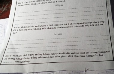 Bài 3. Tìm một số biết rằng được số mới bằng 1/3 số lớn nhất có 1 chữ số. Bài giải Bài 4: Nhà máy sản xuất được 9 080 chiếc áo. Cứ 2 chiếc người ta xếp vào 1 hộp. Cứ 4 hộp xếp vào 1 thùng. Hỏi nhà máy cần bao nhiêu thùng để xếp hết chỗ áo dó? Bài giải Bài 5: Một tàu chở 5405 thùng hàng, người ta đã dỡ xuống một số thùng hàng thì số thùng hàng còn lại bằng số thùng ban đầu giảm đi 5 lần. Cửa hàng còn lại thùng hàng.