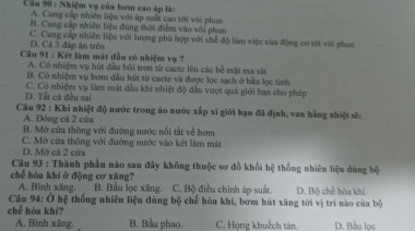 Câu 90 : Nhiệm vụ của bơm cao áp là: A. Cung cấp nhiên liệu với áp suất cao tới vòi phun B. Cung cấp nhiên liệu đúng thời điểm vào vòi phun C. Cung cấp nhiên liệu với lượng phù hợp với chế độ làm việc của động cơ tới vòi phun D. Cả 3 đáp án trên Câu 91 : Két làm mát dầu có nhiệm vụ ? A. Có nhiệm vụ hút dầu bôi trơn từ cacte lên các bề mặt ma sát B. Có nhiệm vụ bơm dầu hút từ cacte và được lọc sạch ở bầu lọc tinh C. Có nhiệm vụ làm mát dầu khi nhiệt độ dầu vượt quá giới hạn cho phép D. Tất cả đều sai Câu 92 : Khi nhiệt độ nước trong áo nước xấp xỉ giới hạn đã định, van hằng nhiệt sẽ: A. Đóng cả 2 cửa B. Mở cửa thông với đường nước nối tắt về bơm C. Mở cửa thông với đường nước vào két làm mát D. Mở cả 2 cửa Câu 93 : Thành phần nào sau đây không thuộc sơ đồ khối hệ thống nhiên liệu dùng bộ chế hòa khí ở động cơ xăng? A. Bình xăng. B. Bầu lọc xăng. C. Bộ điều chỉnh áp suất. D. Bộ chế hòa khí Câu 94: Ở hệ thống nhiên liệu dùng bộ chế hòa khí, bơm hút xăng tới vị trí nào của bộ chế hòa khí? A. Bình xăng. B. Bầu phao. C. Họng khuếch tán. D. Bầu lọc