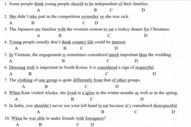 Tìm lỗi sai của câu và sửa nó. Hứa sẽ chấm điểm, mình cần gấp. ----- Nội dung dịch tự động từ ảnh ----- 1. Some people think young people should to be independent of their families. A в D 2. She didn't take part in the competition yesterday so she was sick. C D 3. The Japanese are familiar with the western custom to eat a turkey dinner for Christmas. A в A B D 4. Young people usually don't think country life could be interest. A в D 5. In Vietnam, the engagement is sometimes considered much important than the wedding. A B D 6. Dressing well is important in South Korea; it is considered a sign of respectful. A в D 7. The clothing of one group is quite differently from that of other groups. A в D 8. When Kate visited Alaska, she lived in a igloo in the winter months as well as in the spring. A в D 9. In India, you shouldn't never use your left hand to eat because it's considered disrespectful. A в D 10. When he was able to make friends with foreigners? A B D